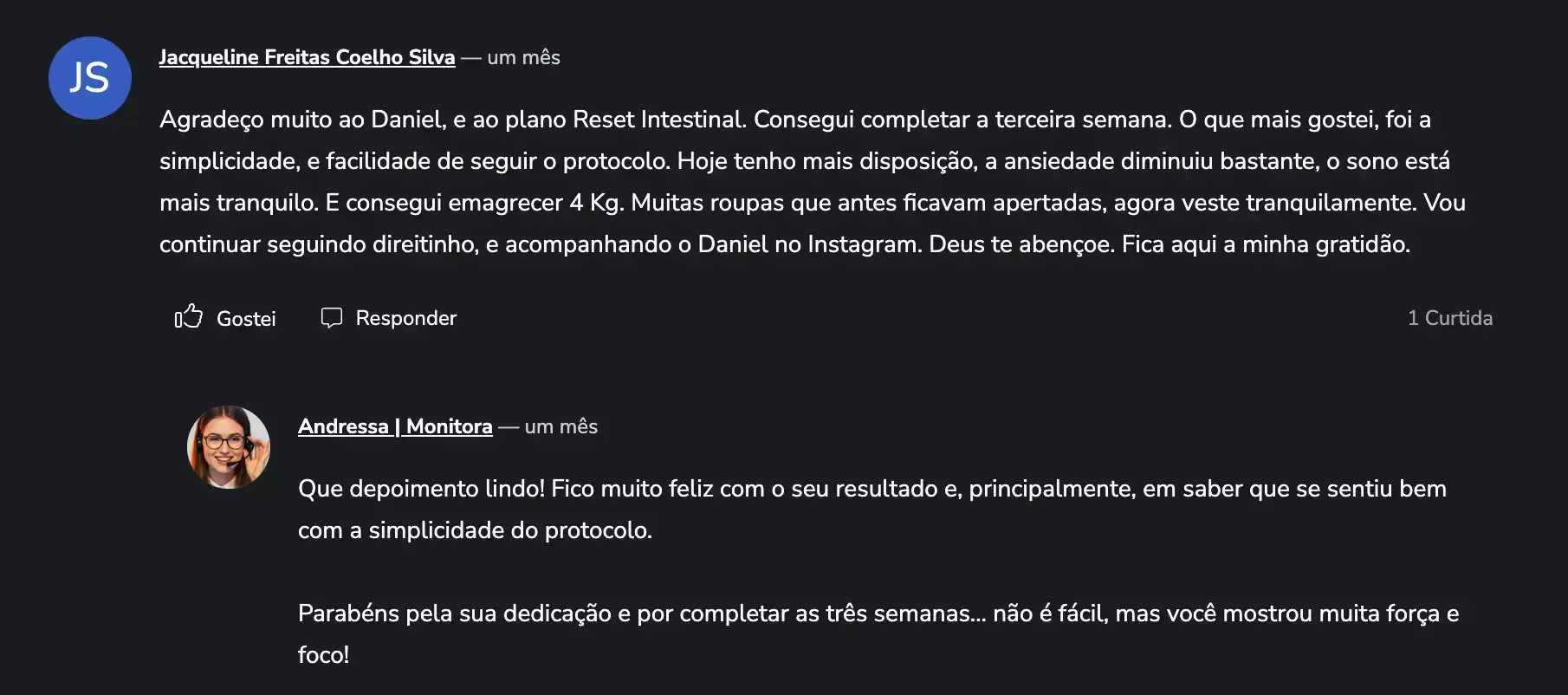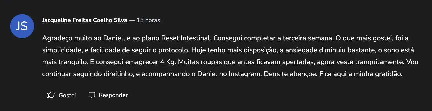 Tudo bem! O RESET não é sobre perfeição, é sobre progresso real e consistente. Se em algum momento você não conseguir seguir 100%, não desista. Volte no dia seguinte com leveza, o que importa é manter o compromisso com sua saúde. Inclusive, os materiais foram pensados para isso: você pode ouvir o audiobook, revisar o cardápio, adaptar as refeições e seguir no seu ritmo, sem culpa. O importante é continuar. Porque cada passo que você dá, mesmo pequeno, já é uma vitória para o seu intestino, sua energia e seu bem-estar. O acesso é liberado por 1 ano, então você pode fazer no seu ritmo. O importante é não parar e continuar avançando, mesmo que aos poucos.